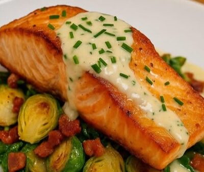 Keto Baked Salmon with Horseradish Cream Sauce & Roasted Brussels Sprouts